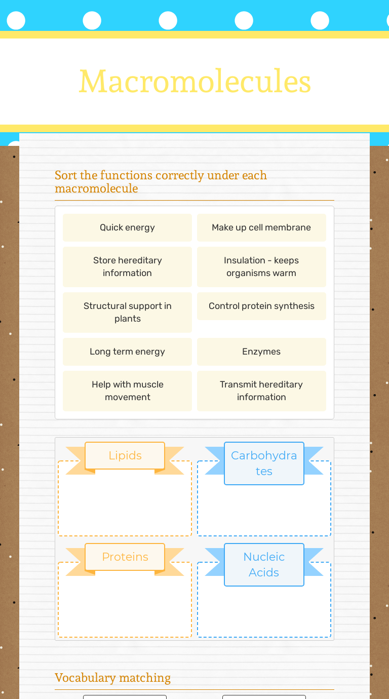 Organic macromolecules worksheet answer key. Are lipids soluble in water? Match the monomer on the left to the macromolecules on the right. Each macromolecule has a particular role in the metabolism of organisms. Learning outcomes define the term "macromolecule" distinguish between the 4 classes of macromolecules now that .